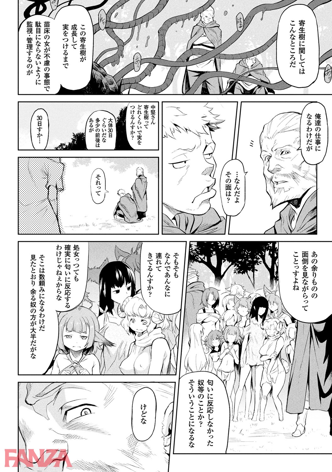 地中に潜んで生きる謎の植物「寄生樹」。それは一年に一度だけ、強い催眠作用を持つ匂いを放つという。その匂いを嗅いだ女性たちは理性を失い、まるで導かれるように寄生樹のもとへと集まってしまう。集められた女性たちの足元からは触手のような枝が伸び、彼女たちの身体を苗床として利用しながら繁殖を始める。寄生樹は女性の体液を栄養に成長し、種を植え付けることで次の命を残していくのだった。しかし、匂いに反応せず正気を保つ女性たちも存在していた。寄生樹の繁殖の裏で、彼女たちの存在が新たな波紋を呼ぶことになる――。