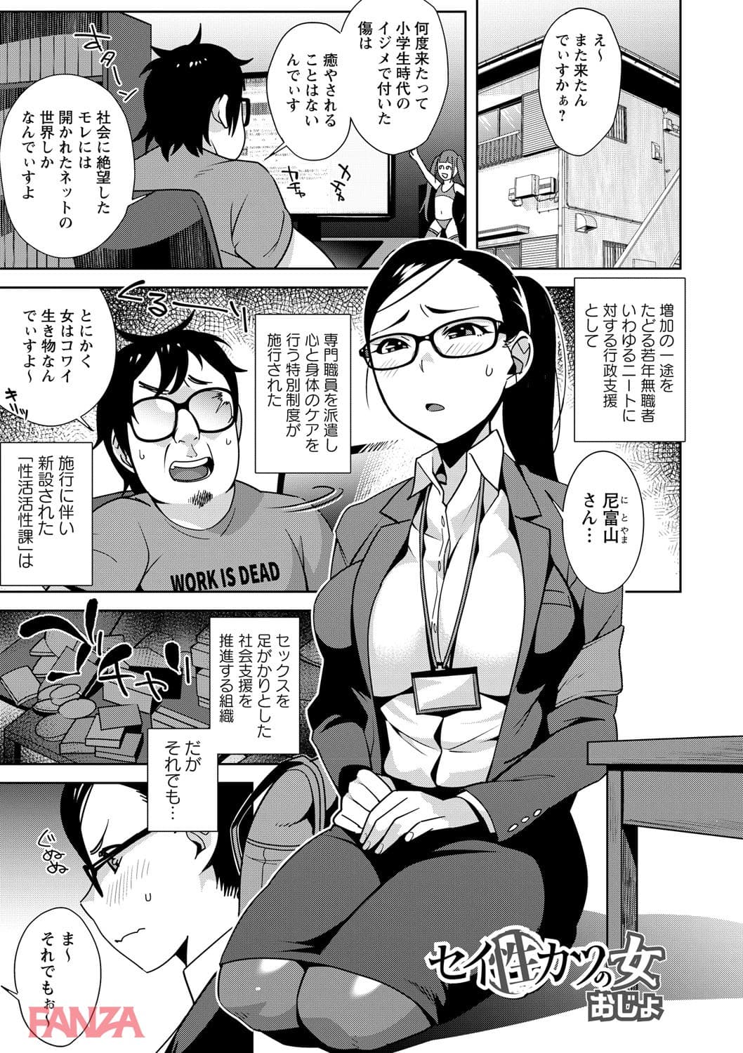ひきこもりニートを更生させるために市は性活活性課というものを創設した。これはひきこもりニートとセックスをして社会へ復帰させるというプロジェクト。今回も早速クライアントのもとへ赴く性活活性課の女。巨乳を見せつけて乳首を吸わせながら授乳逆手手コキでフィニッシュさせる。女は精子を見て興奮してしまいそのまま生チンポを挿入し、中出しさせる。どうやらそのヒキニートのチンポの虜になってしまったようだ。