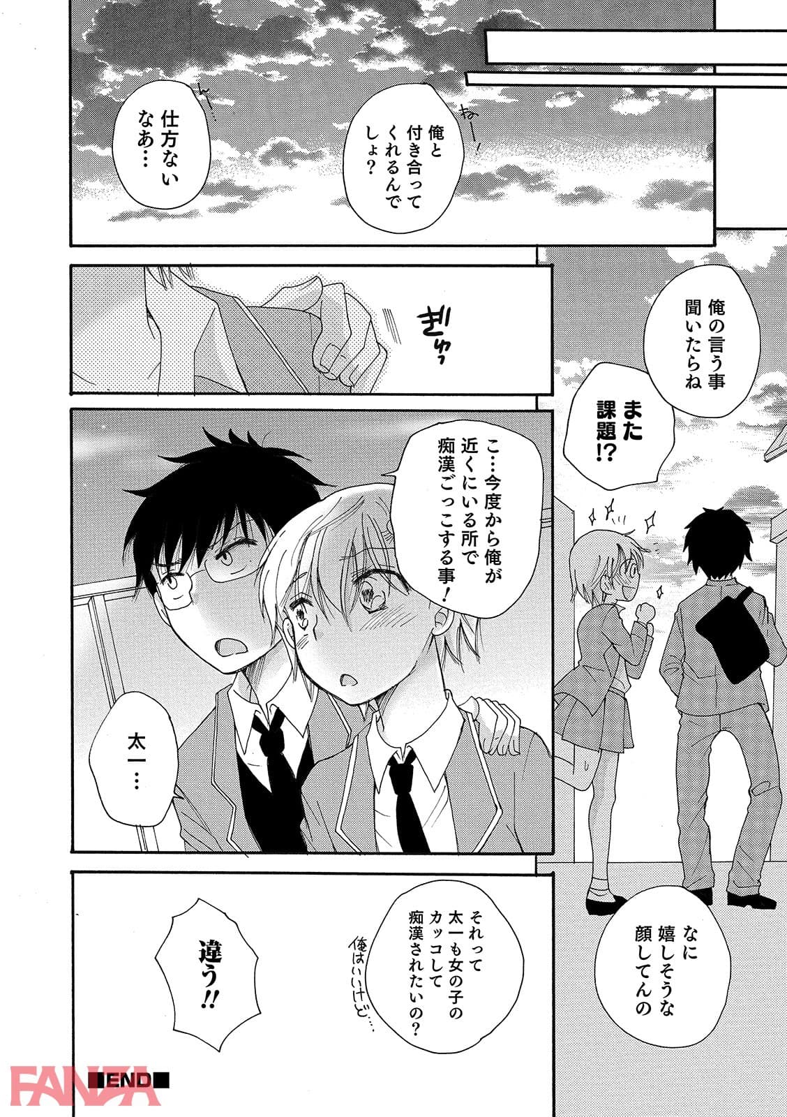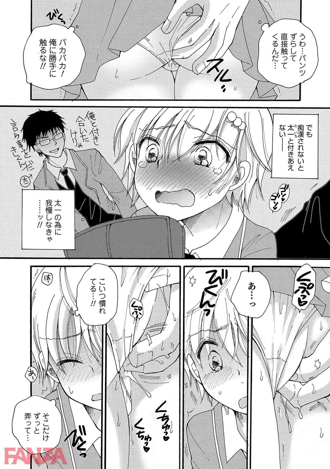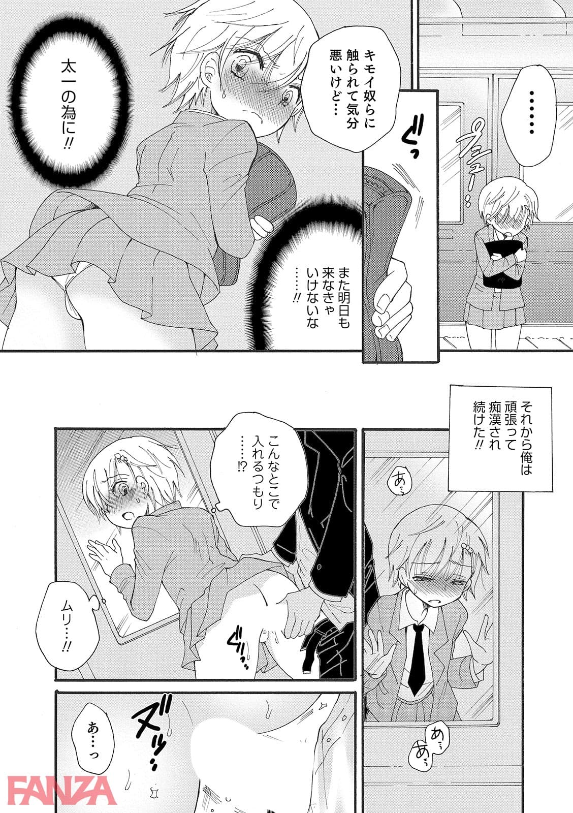男の娘が電車内で痴漢されるエロ同人誌。これもとある男の彼女になるための試練。致し方なし。満員電車に乗るとおっさんたちがこぞって痴漢してくる。金玉を揉まれてアナルにチンポを突っ込まれて中出しされる男の娘。手コキでどっぷんどっぷんびゅるるっと射精!課題をクリアした男の娘は彼女になることに成功する。やっとあなたの彼女になれた…!