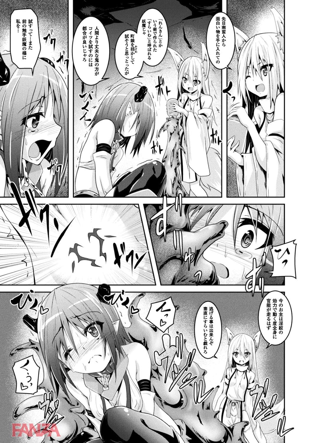 やっと見つけた妖狐…あれからお前をどれだけ探したか…。美少女ヒロインは威勢だけは良く妖狐に捕らわれてしまう。そしてスライム触手に犯される美少女ヒロイン。子宮内にまで侵入されさらに尿道までもがその犠牲となる。そのあまりの快楽にオーガズムに達してしまう。犯されていようが気持ちいいものは気持ちいいらしい。