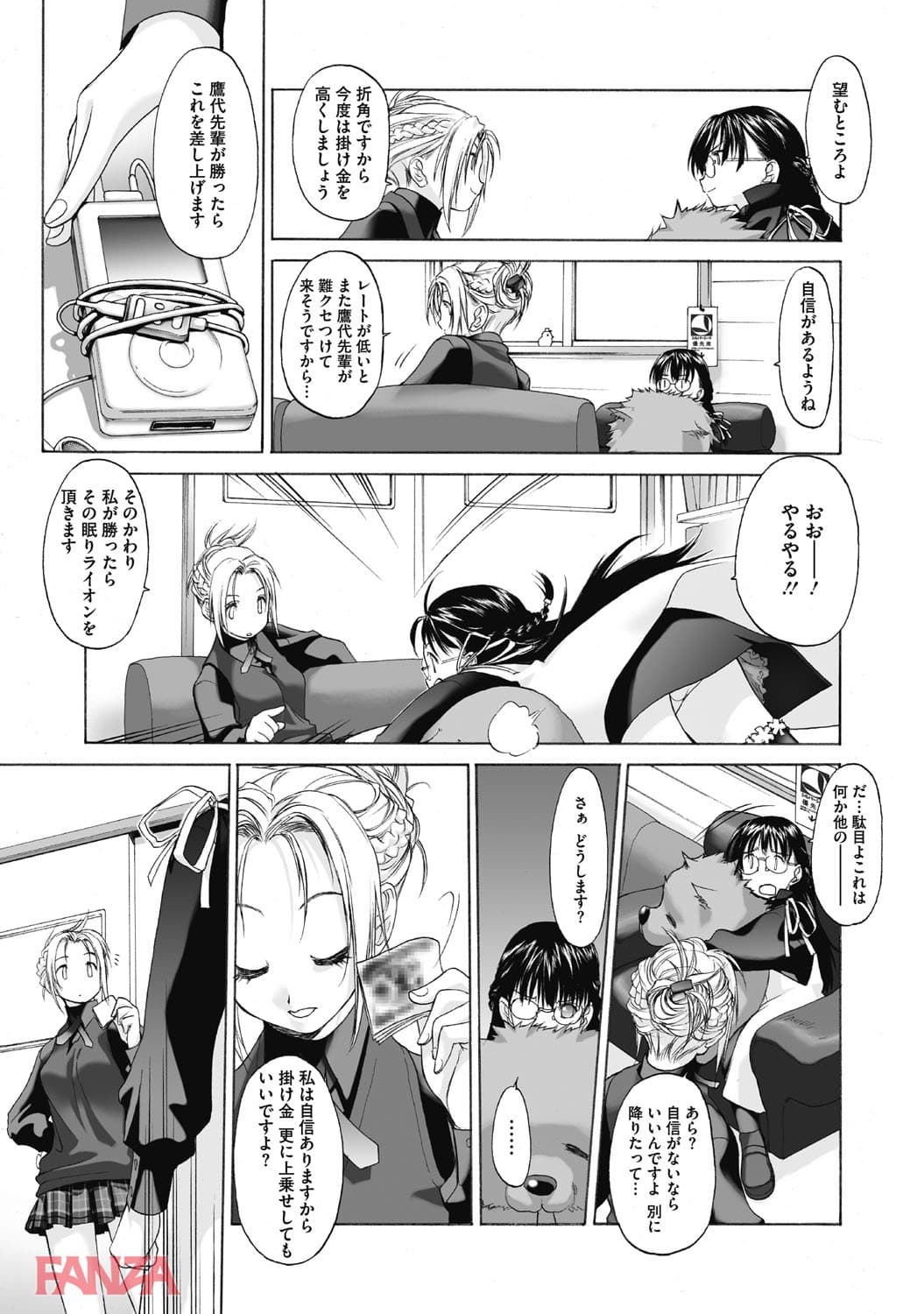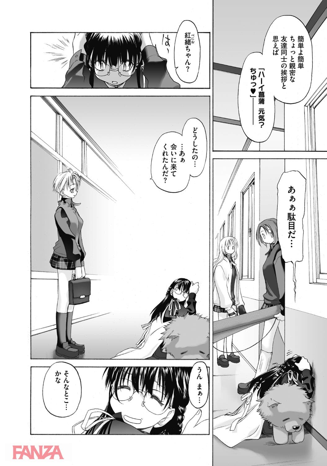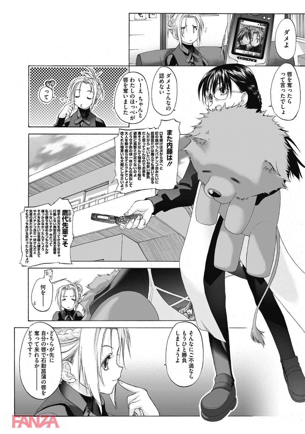 女と女の真剣勝負。あの娘の唇を最初に奪った方の勝ち。勝負をするのは桃子と紅緒。ターゲットとなるのは菖蒲だ。菖蒲を呼び出すことに成功した紅緒は、なんとキスをする前に菖蒲から告白される。これは願ってもいないチャンス。どんどんエスカレートしてレズ行為に発展していく。こちらからキスをするまでもなかった。乳首を吸われて優しくレズキス。勝者は紅緒。そして二人は付き合うことに。