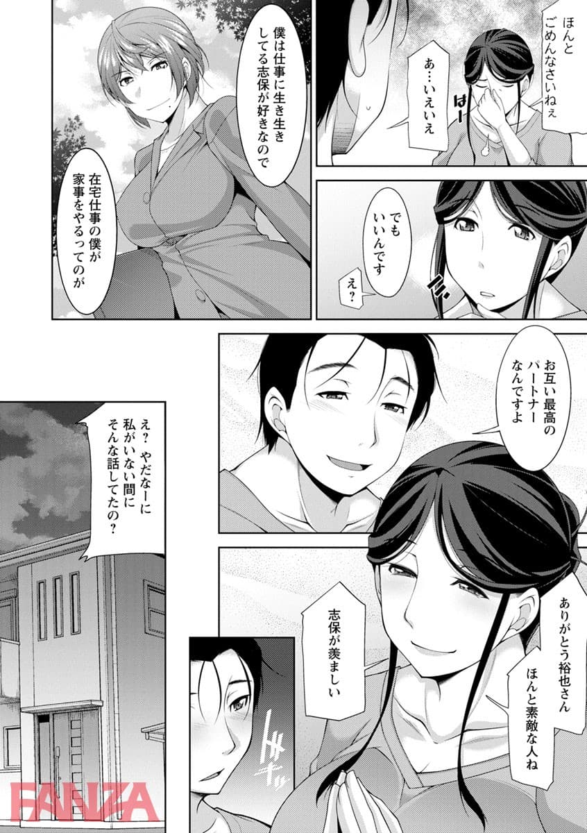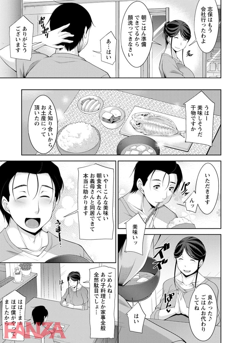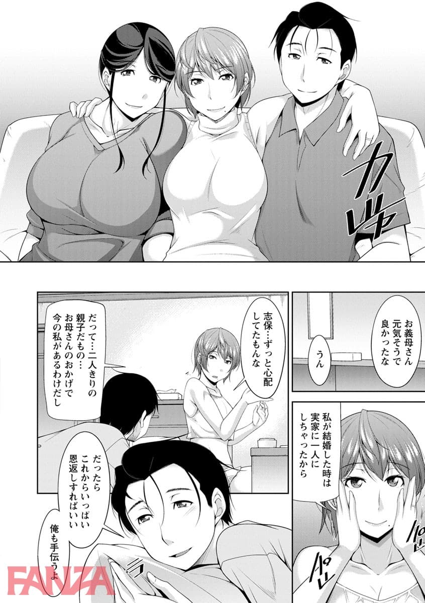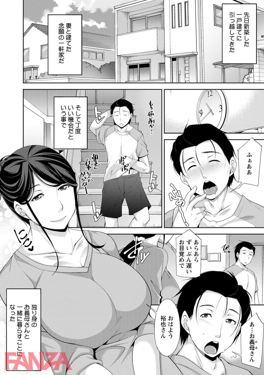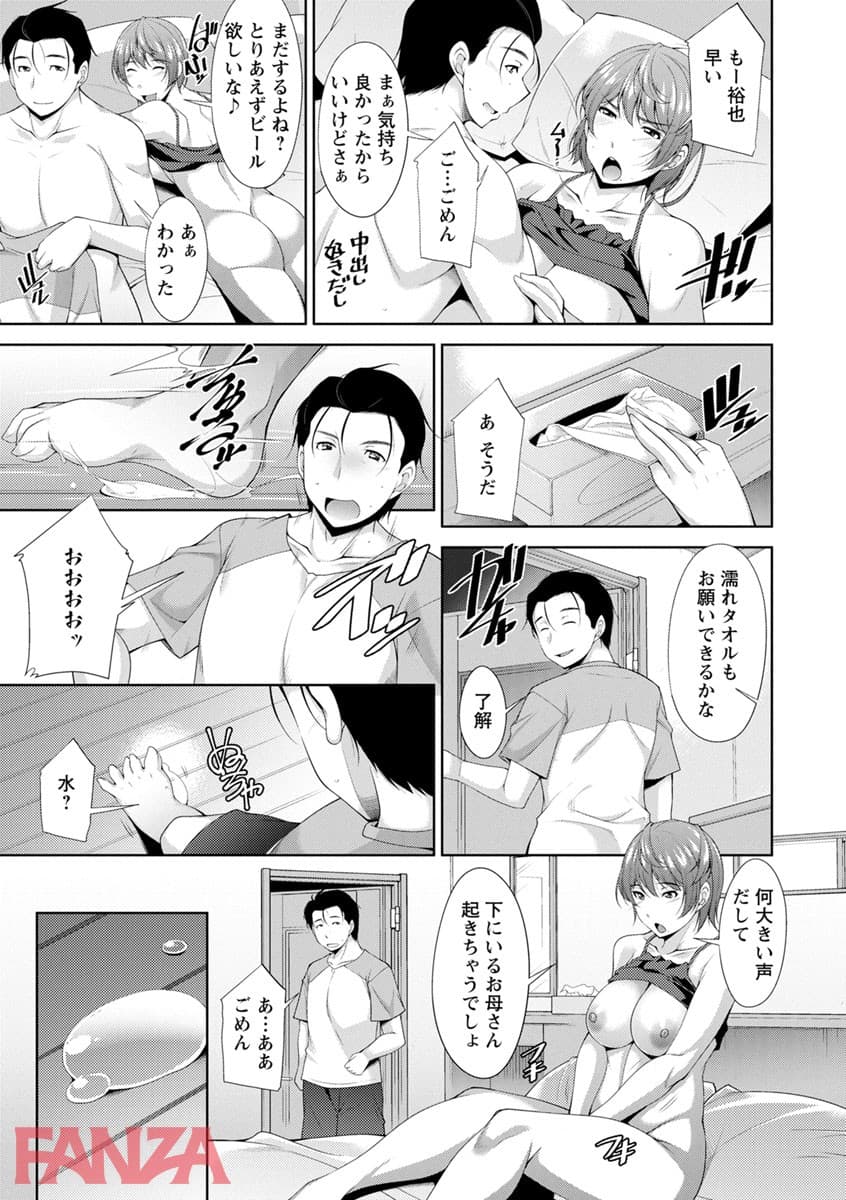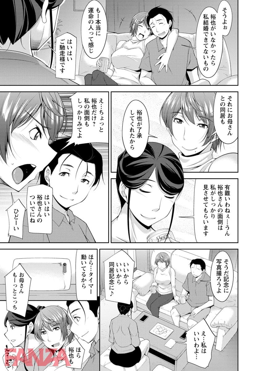 嫁と義母の三人暮らしをする裕也。もちろん嫁とは今もラブラブ。夜の営みの順調だ。今夜も裕也は嫁にチンポをハメて必死に腰を振る。もちろんコンドームなどもせずに生のまま挿入。絶賛子作り中というわけだ。裕也は嫁のマンコにたっぷり中出し。今日も一仕事を終えて部屋を出る。すると、その廊下に何か湿った水たまりができていた。これは一体?義母はこっそりと二人のセックスを覗きながらオナニーをしていたのだ。