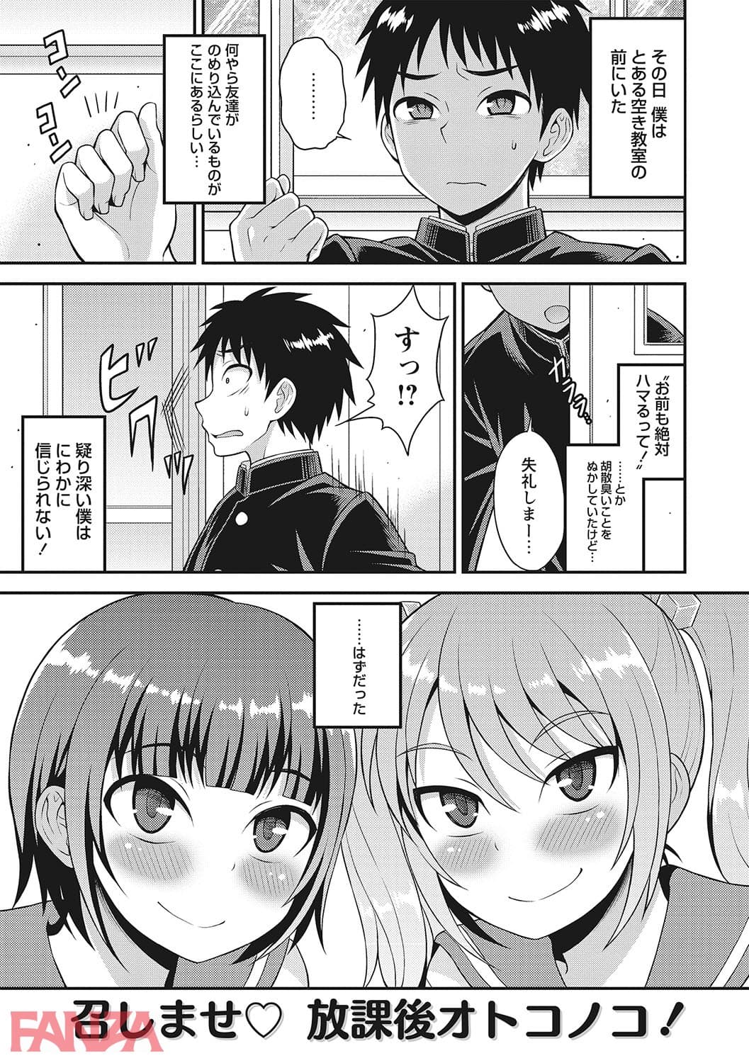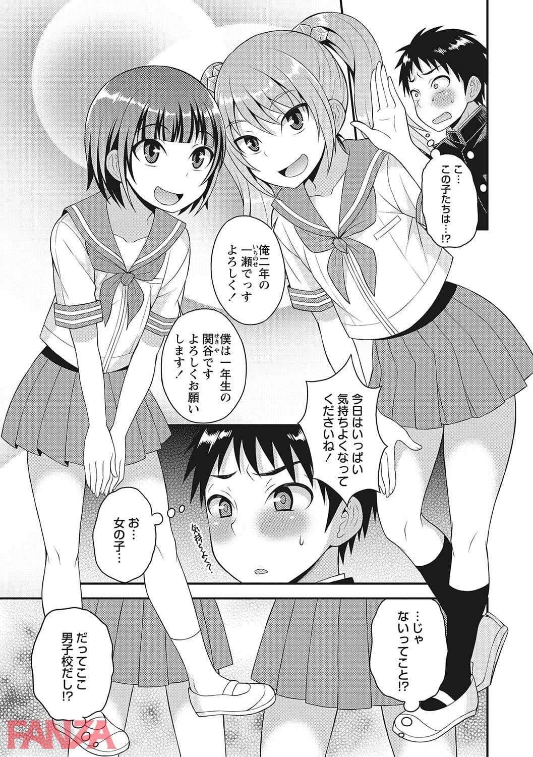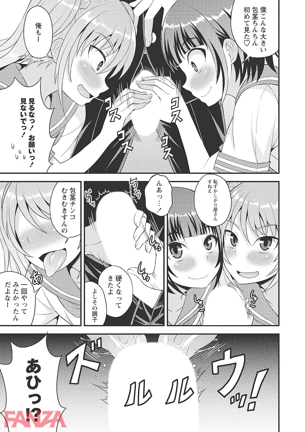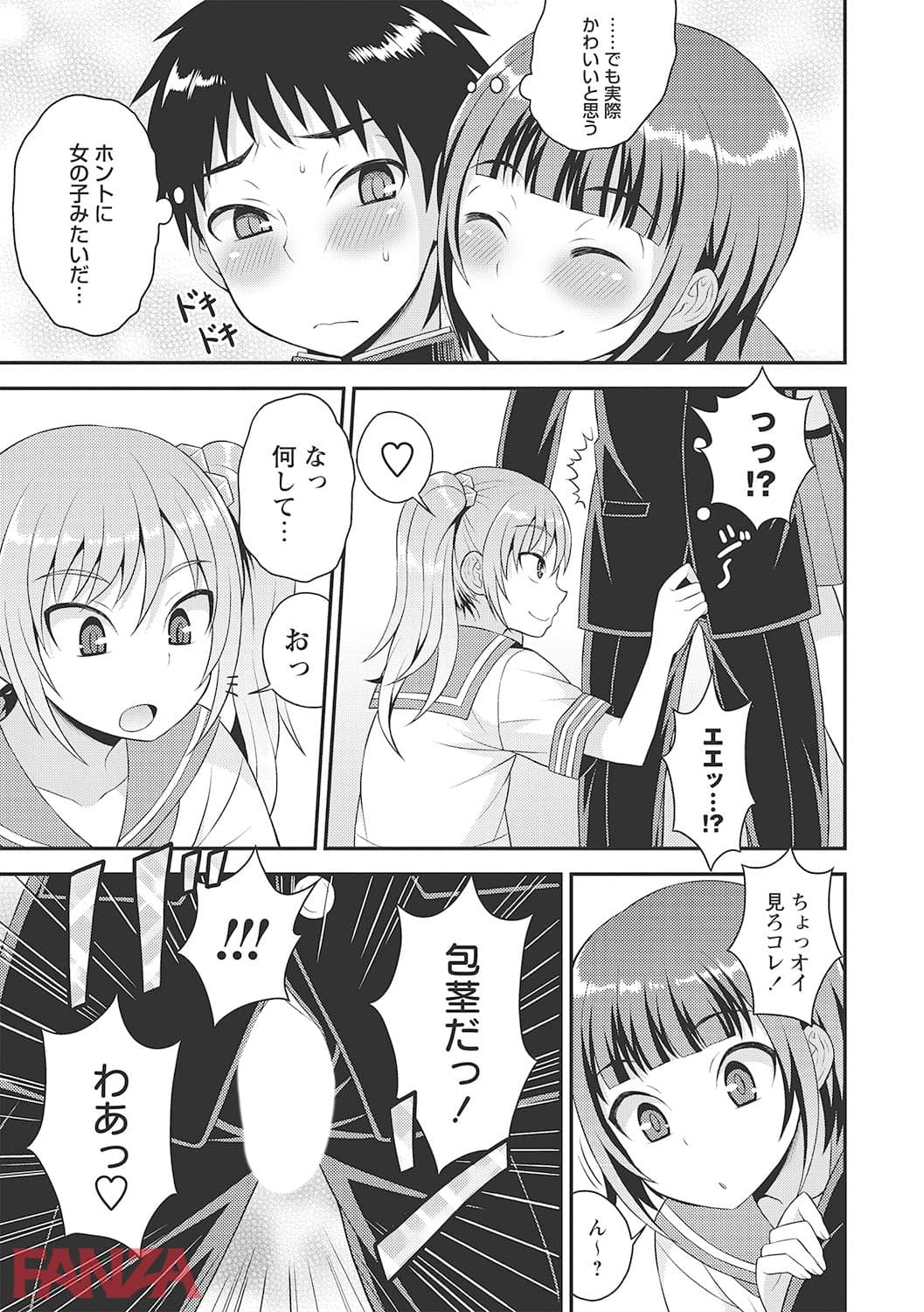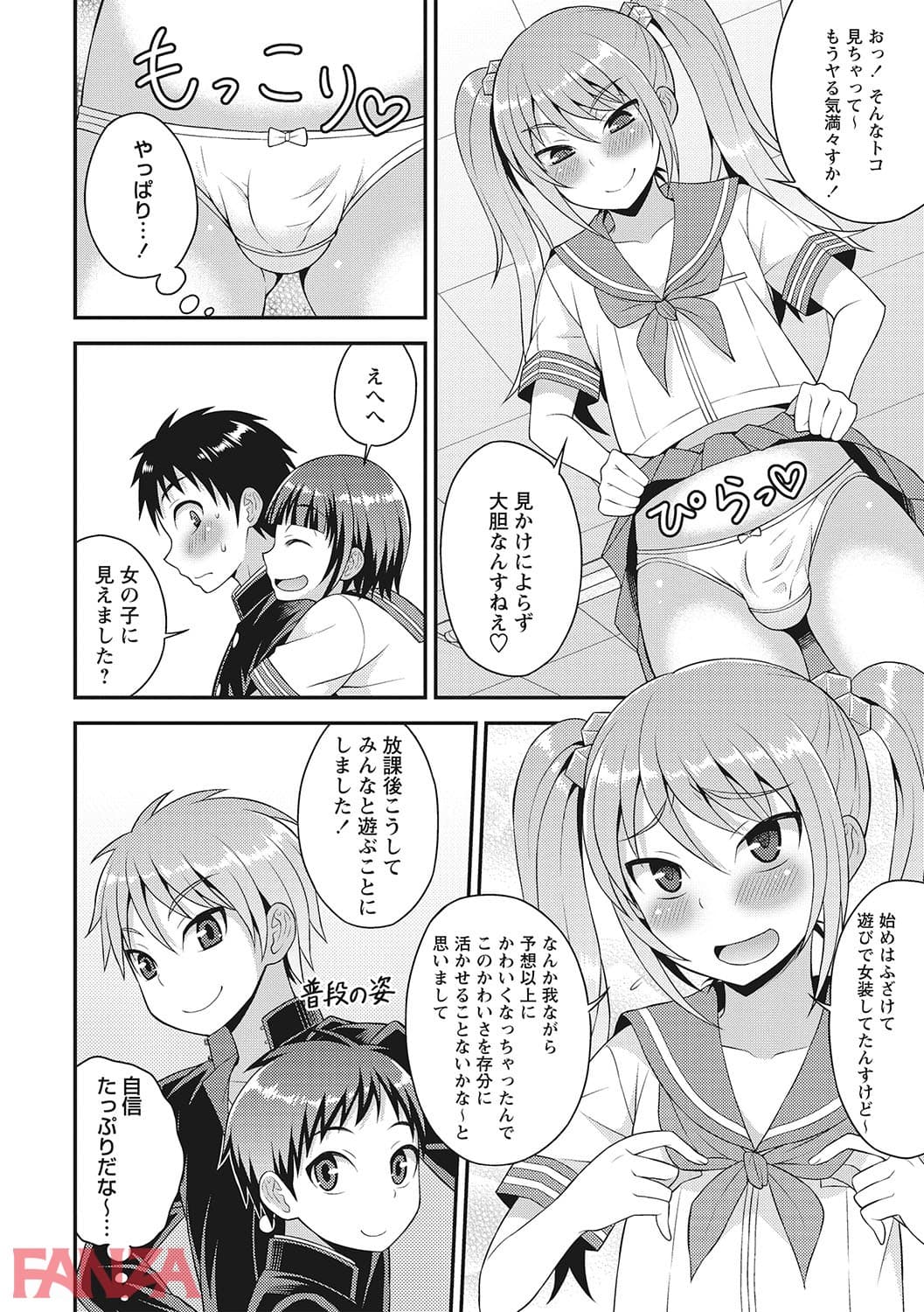 女装が趣味の男子二人。元々女の子っぽい体型や顔立ちのためかつらをかぶれば女の子と見分けがつかない。ここはとある空き教室。扉を開けると待っていたのは二人の男の娘。いらっしゃい!いきなりチンポをぼろんさせられた男子生徒。うわー包茎だあ!包茎チンポを見るなりテンションがあがる男の娘たち。そして、そのチンポをぱっくんちょ。美味しそうにペロペロ舐めまわす。射精感がこみあげてきて男子生徒は二人の顔にザーメンをぶっかけてしまう。男の娘のエロテクにハマっていく―。