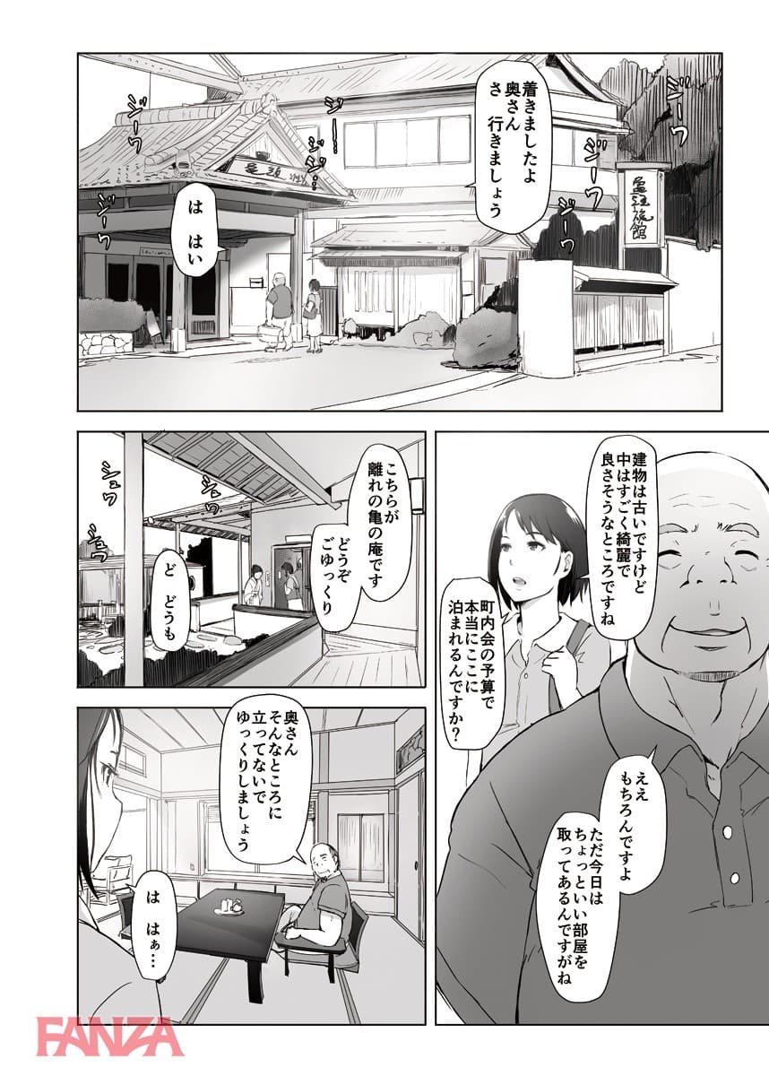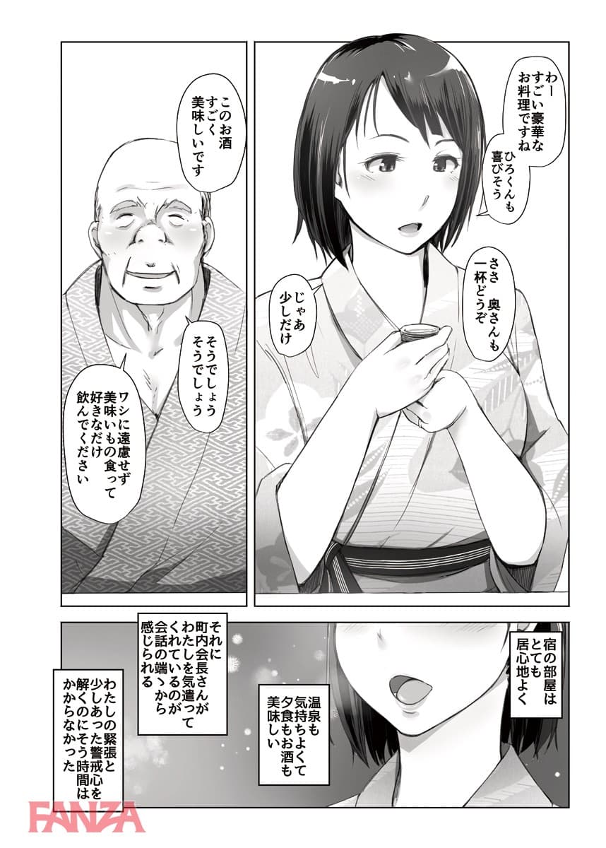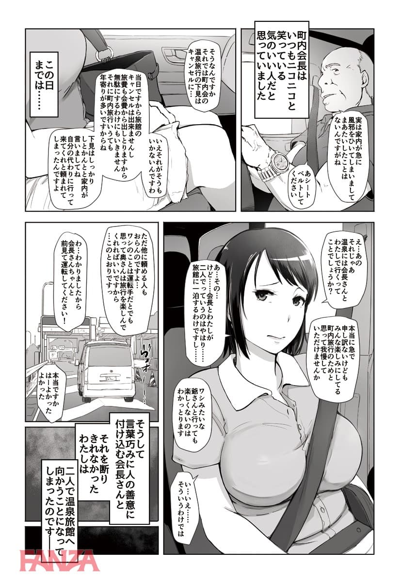 町内会の旅行の下見に行くということで町内会長のデブキモおっさんと旅行へ行くことになった人妻。まさかあんなことになろうとは…。温泉宿についてお酒が進む。町内会長もここぞとばかりに飲ませてくるのでついつい飲みすぎて寝てしまう。そんなところへ町内会長はちんぽをぶっこむ。獣のようなチンポ突きに悶えて中出しされてしまう人妻であった。