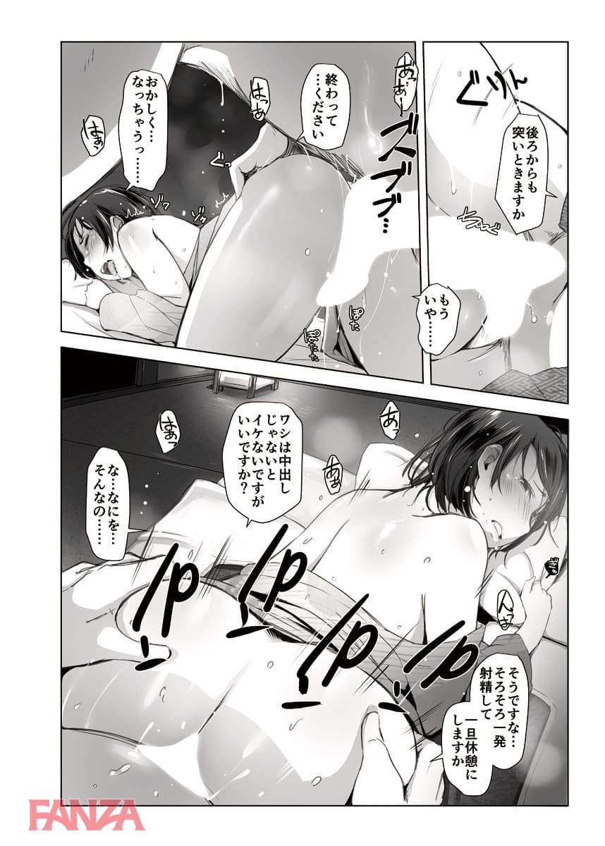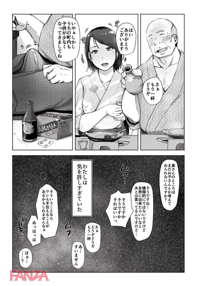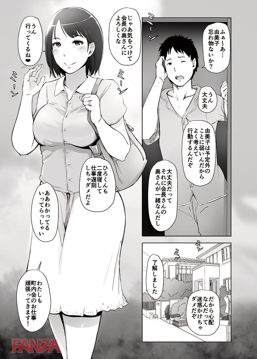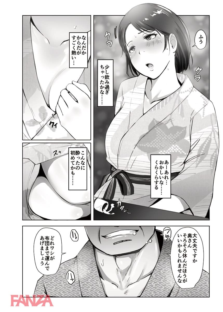 町内会の旅行の下見に行くということで町内会長のデブキモおっさんと旅行へ行くことになった人妻。まさかあんなことになろうとは…。温泉宿についてお酒が進む。町内会長もここぞとばかりに飲ませてくるのでついつい飲みすぎて寝てしまう。そんなところへ町内会長はちんぽをぶっこむ。獣のようなチンポ突きに悶えて中出しされてしまう人妻であった。